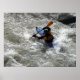 Um kayaker a solo dirige seu artesanato através de águas turbulentas rápidas no rio Feather, no Norte da Califórnia. Piscinas, cachoeiras e chuvas estreitas profundas entre as pedras gigantes contribuem para qualquer excitante corrida fluvial.