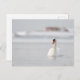 Nadadores de mudas nadando em água gelada com gelo e neve cobertos de ilha no cartão postal de fundo.