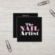 Um design de modelo de cartão de negócios de artista de unhas editável, com código QR, identificadores de mídia social e tipografia de vintage em rosa e branco sobre fundo preto. Código QR verificável direciona instantaneamente os clientes para a página de reserva. Tipo de dentro de padrão floral.