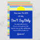 Jogo chá de fraldas Não diga sinal de bebê. Design de Combinação para Aqui Vem O Chá de fraldas Son Summer Stripes. Um design moderno, divertido e colorido para um chá de fraldas de verão otimista. Fonte alegre e divertida para áreas de texto. A Design de placa de papel amigável do orçamento faz parte da Coleção de Stripes de Verão, que inclui convites para chuveiros de bebês, jato de fralda e caixas de biblioteca de livros, material de festa, decorações, presentes e muito mais.