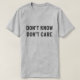 Se você é alguém que tem "não saiba, não se importe" a atitude e o estilo de vida, a seguir você é já dez etapas antes de todos mais até a paz e a felicidade vai. Mostre ao mundo como feliz você é apenas sendo você mesmo e vestindo este t-shirt.