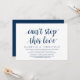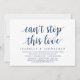 Cartão de convite de casamento furtivo temático Moderno Azul Marinho (Não Posso Parar Este Amor). É perfeito para o seu jantar de casamento casual à beira do lago, dança e festa.