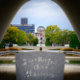 Imagem mostra o Cenotáfio Memorial no Parque Memorial da Paz de Hiroshima com a inscrição 'Que todas as almas aqui descansem em paz, pois não repetiremos o erro.'