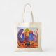 Uma pintura colorida, divertida e imaginativa representando alguém em um carro deixando uma cidade com prédios tortos.