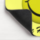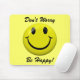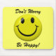 ' Não se preocupe esteja feliz!" com um brilho, botão feliz clássico da cara no original, amarelo tradicional com características pretas corajosas. O fundo é uma luz - a cor amarela que adiciona ao cheerfulness. Pnha sobre uma cara feliz com este mousepad brilhante! Um grande lembrete para manter-se sorrir, mesmo se você está tendo aqueles problemas temidos do computador! Um divertimento e um presente feliz!