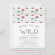 Adoráveis convites para chuveiros de bebês para seu selvagem no caminho apresentam uma borda de setas coloridas com penas em marinho, lacre e vermelho. "Nascer de ser selvagem" aparece em marinho azul, com os detalhes do seu chá de fraldas embaixo.