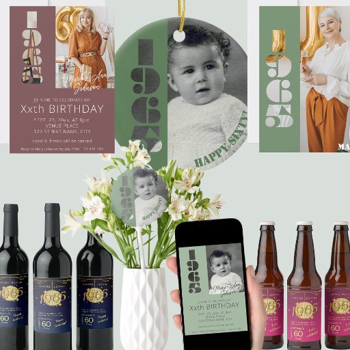 Convidado ao estilo Vintage para uma 60ª rocha de festa de aniversário! Prepare-se para se mover sob a bola de disco, com um esplaxo de tons de rosa claro e um guião de groovy "1965" em um fundo verde teal de tons tonados.
