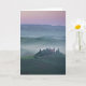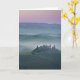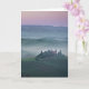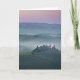 Cartão com um nascer do sol nevoento com um céu e uma névoa cor-de-rosa entre as colinas de Tuscan sobre a casa da quinta do Belvedere do IL do podere do agriturismo no Valdorcia (vale de Orcia) entre Pienza e San Quirico em Toscânia, Italia.