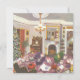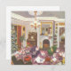 Ilustração Vintage design de Natal Feliz com o interior de uma sala de estar com um espelho sobre a lareira, móveis e um candelabro. Esta sala acolhedora está cheia de presentes, papel de embrulho e fita na véspera de Natal. Um gatinho fofo está dormindo em um otomano.