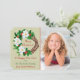Sua própria fotografia tira o palco central do lado direito deste cartão festivo de Natal plano moderno. O lado esquerdo tem a imagem de uma coroa verde decorada com flores brancas e bagas vermelhas. As cores predominantes são verde e vermelho. Cinco campos de texto personalizados estão em vermelho e verde. A parte traseira da placa tem um padrão bonito de floco de neve dourado sobre um fundo vermelho correspondente.