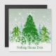Natal gaélico irlandês - Árvores de abeto verdes nevadas e estrelas brancas cintilantes em um fundo verde claro. O texto irlandês na frente diz: Feliz Natal para você (endereçado a uma pessoa).