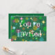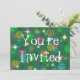 Um design divertido, festivo, retrô inspirado por luzes de fada coloridas do arco-íris em uma árvore de natal. Convite com um design verde, azul, rosa, laranja amarelo e verde personalizável para você personalizar com seu próprio texto, fotos e ideias. Criado usando técnicas digitais por jess perry.