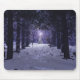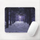 Uma árvore de Natal cintilante em uma floresta de pinheiros coberta de neve numa noite de inverno.