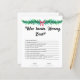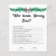 O Jogo do Chá de fraldas "Quem Conhece a Melhor Mamãe" de Natal é uma reviravolta festiva num jogo de chá clássico que traz alegria de férias ao seu evento. Adorado com sotaques de pínus com tema natalino, e delicados toques vermelhos e verdes, este cartão de jogo permite que os hóspedes testem o seu conhecimento sobre a mãe a ser com perguntas divertidas. Ideal para chás de fraldas de inverno, acrescenta um toque sazonal à celebração, criando uma atividade envolvente para os hóspedes aproveitarem enquanto competem por prêmios e aprendem mais sobre a mãe que espera. Perfeito para uma atmosfera confortável e festiva de chá de fraldas!