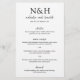 Menu de casamento moderno (impresso em papel de impressora fino) com um design preto e branco simples e mínimo com seu monograma em negrito juntamente com seus nomes em um roteiro elegante.