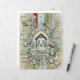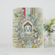 The design features a vintage-inspired background of distressed paper, sheet music, and rustic stamps, giving it an authentic aged feel. The centerpiece is a snowy Nativity scene framed by a gorgeous, elaborate wreath.