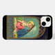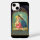 beautiful vintage painting of madonna and child inside a golden archway with gold stars in a blue sky. mary holding baby jesus in her arms and wearing red dress, blue cloak, blue and white headdress and a golden ring halo above her head. decorative nativity picture with madonna and child looking at each other, landscape in the background and a table with hay in the foreground. vintage christmas painting in reds and blues.