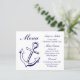 Adicione diversão às suas mesas com este charmoso cartão de menu náutico azul e branco marinho. Este cartão de menu bonito apresenta uma âncora azul de envio desenhada à mão destacando suas opções de comida impressas em complemento do script do marinho e fontes fáceis de ler. Este menu de âncora inspirado no marinheiro é perfeito para * verão, praia e casamentos náuticos * eventos comerciais * festas * angariadores de fundos e instituições de caridade * cerimônias de prêmio