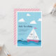 Convite de festas de aniversário de criança náutico encantador apresenta um claro fundo azul do céu com nuvens e aves marinhas, e um veleiro cor-de-rosa navegando em mares calmos. Personalize com os detalhes do seu partido, com a data e a hora mostradas nas velas do barco. Cartões à volta das faixas náuticas rosa e branca.