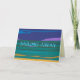 Este cartão de cartões de natal. é uma pintura colorida do mar e da areia em azuis dos verdes, roxo da areia pink.and. Texto na "navigação dianteira afastado"