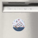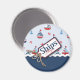 Cores náuticas em vermelho clássico, branco e azul com âncora e caranguejos e uma etiqueta de menino novidade com fio.