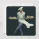 Ilustração antiga de comida e design da indústria de panificação apresentando um padeiro francês profissional usando um chapéu elegante e um avental. Um chef de pastelaria carregando pastéis caseiros, bolos, biscoitos, cupcakes, doces e outras sobremesas em bandejas frescas do forno na padaria. Ele está tão feliz que parece estar dançando!