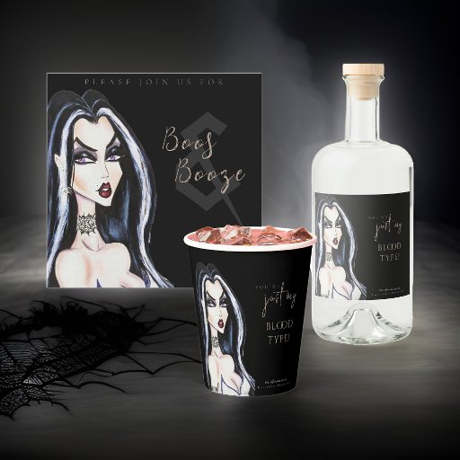 Você é só o meu tipo de sangue! Estas etiquetas de licor de Halloween captivamente pervertidas são desenhadas com uma bruxa gótica a aquarela pintada à mão e uma tipografia inteligente. Personalize com seus próprios detalhes de partido personalizado por uma noite para se lembrar!