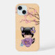 Ilustração vetorial de uma gira oriental com orelhas de gato preto num vestido quimono roxo segurando um peixe dourado num saco plástico cheio de água. O cabelo preto da menina é decorado com arcos roxos e sinos de gato. Garotas com orelhas de gato são chamadas de "Nekomimi" no Japão, o que significa literalmente "orelhas de gato". A palavra "Neko" (gato) também é frequentemente utilizada para as descrever. Esta trabalho de arte foi inspirada pelas bonecas kokeshi tradicionais do Japão.