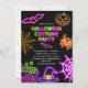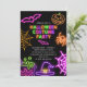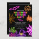 Acenda a noite com este convite de festas de fantasia neon Halloween, com teias de aranha brilhantes, abóboras, morcegos e inscrições assustadoras. Perfeito para encontros de outubro, eventos de truque ou tratamento e festas de casas assombradas.