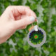 Esta bonito chaveiro apresenta uma fotografia de uma flor de marigold que foi manipulada para criar uma bela flor de neon com um centro vermelho e verde brilhante cercado por pétalas com tons sutis de amarelo, verde e azul. A flor se senta sobre uma cinza ardente para enfatizar o centro brilhante e criar uma atmosfera sangrenta.