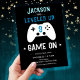 Simples convite de aniversário para jogadores de controlador de jogos minimalista. Você alcançou o nível em qualquer idade! Todo texto é personalizado. Linhas simples e divertidas na parte de trás do cartão.