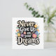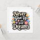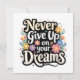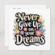 Typography of Never Give Up On Your Dreams surrounded by flowers.