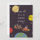 Cartão de Natal com uma ilustração divertida de papais noeis e suas renas voando pelo espaço com a saudação "E a toda uma boa noite".