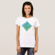 Uma camisa branca com um nó celta azul-esverdeado com borda, em um design em forma de diamante.