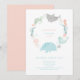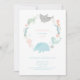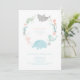 Este convite de aniversário temido para o animal marinho apresenta uma baleia, tubarão-tigre, geleia, tartaruga-do-mar, nadando em círculo com uma camada de fundo rosa-casca-mole.