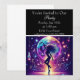 Convite de festa Experimente a energia elétrica das noites de discoteca com esta vibrante ilustração digital. Uma dançarina silhuetada faz uma pose comemorativa, com o cabelo rodopiando ao seu redor. Uma grande bola de discoteca reflexiva projeta padrões de luz coloridos pela cena. Notas e símbolos musicais dançam no ar, enfatizando o tema de música e dança. Roxos, azuis e dourados brilhantes criam uma atmosfera festiva e energética. O estilo de arte gráfico moderno é ideal para uma festa ou boate.