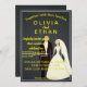 Esta elegante caligrafia negra e dourada, tudo num convite de casamento, é perfeita para um casamento moderno. A design romântica minimalista apresenta uma magnífica e elegante tipografia negra e dourada num fundo rústico e chico com um gráfico simples para uma noiva com vestido de noiva.