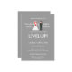 Esta diversão e geek, porém simples e chic salvam a data do convite de casamento... tem noiva de 8 bits e personagens de noivos com sotaques roxos olhando uns para os outros contra um fundo de cinza prateada. A noiva tem cabelo vermelho e buquê vermelho