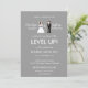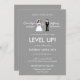Esta diversão e geek, porém simples e chic salvam a data do convite de casamento... tem noiva de 8 bits e personagens de noivos com sotaques roxos olhando uns para os outros contra um fundo de cinza prateada.