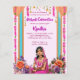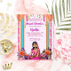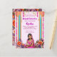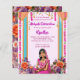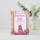 Mehndi convite para modelo de casamento indiano com uma bonita caricatura de noiva em roupas cor-de-rosa e flores cor-de-rosa.