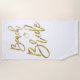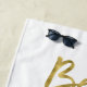Toalha de praia com texto preto dourado da Praia (aparência, imitação) e anel impresso em fundo branco