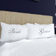 Uma fonte romântica e espiralada usada neste par de fronhas de noite de núpcias. Você pode alterar o texto para os nomes da Noiva e do Noivo para que eles saibam de qual lado da cama pertence a eles.