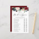 Adivinha quem disse. Era a noiva ou noiva? | Adicione este chá de panela divertido e divertido Que Ele Disse Que Ela Disse Cartão de Jogo ao seu evento. Apresenta a terra floral de cor-de-água de flores de burgundy, vermelha, esbranquiçada e marinho com acentos de folhas de eucalipto. Personalize adicionando suas perguntas. Este cartão floral de adivinhação de chá de panela floral é perfeito para chás de panela de outono e chás de casamento.
