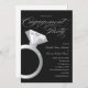 Um belo e elegante convite de festa de noivado, com um anel de diamante grande do lado esquerdo, e a palavra "festa de noivado", num roteiro elegante, por cima. ©Dream Loft