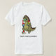 Um desenho de um monstro de lagarto engraçado comendo gnomos de jardim inocentes com as palavras "nom nom gnomo"