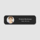 Um Nome de etiqueta minimalista com um fotograma circular para a empresa do funcionário ou pequena empresa com nome e cargo ou serviço, tudo em um fundo negro. Você também pode adicionar seu próprio logotipo em vez da foto!