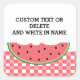 Comemore o verão com essa divertida reunião familiar, CHURRASCO de quintal ou etiqueta/adesivo de nome de etiqueta da empresa com uma fatia de melancia colocada contra um pano de mesa de piquenique vermelho e branco. Adicione seu nome, texto personalizado ou exclusão para permitir que o pessoas escreva em seu nome.