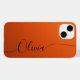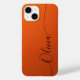 Orange Shimmer White Elegant Calliografia Script Personalizado Nome Personalizado iPhone 14 Smart Capa de telefone apresenta um design moderno e moderno simples e na moda com seu nome personalizado em elegante texto caligráfico escrito à mão tipografia de script de caligrafia em um fundo metálico laranja. Elaborado por ©Evco Studio www.zazzle.com/store/evcostudio