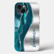 Este design apresenta uma aquarela chic teal agate geode cortada com folha de falso prateado à esquerda, e uma imagem de folha de falso prateado à direita na forma de uma onda bordada com falso brilho prateado. Personalize-o com seu nome ou monograma em uma fonte de pincel manuscrita na moda.