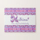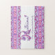 Nome personalizado do monograma K, que significa quebra-cabeça de serra. Bonito letra inicial K monograma desenhada à mão e que significa moça-serra em roxo, rosa e branco. Ideal para um presente personalizado para uma garota que tem um nome que começa com a letra K. Este exemplo lê Katrina Pure. Uma beleza tenra do precioso ou você pode personalizar o texto com seu próprio nome e mensagem ou palavras. Faz o aniversário de uma garota única, ou presente de feriado. © Letra tipográfica K flores e corações desenho manual e padrão criado exclusivamente por Sarah Trett. www.sarahtrett.com para www.mylittleeden.com
